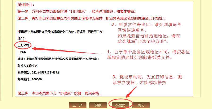 2.将加盖企业公章及法人章的扫描原件以及打印出来的账号注册信息表,按页面操作指引的提示地址,按不同业务区域分别邮寄给相关联系人,并填写快递单号,具体操作界面如下图: