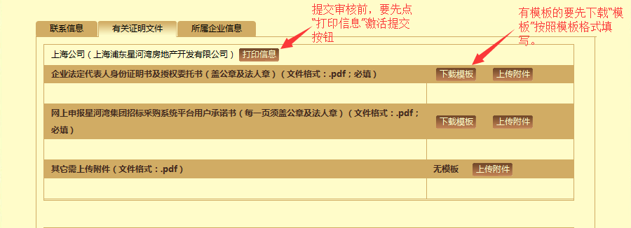 :有模板则必须先下载模板,并按照模板内容进行填写,模板不得修改,填写完整后打印并加盖企业公章及法人章/法人签名,然后扫描成PDF